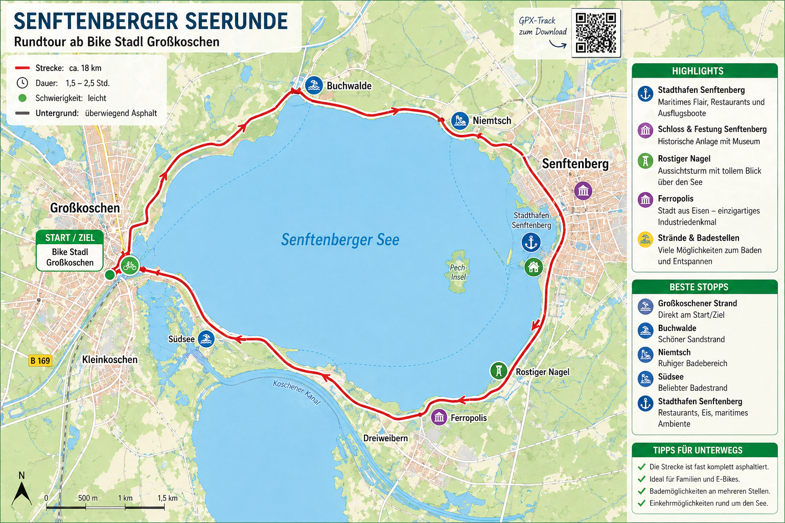 👉 Der Rundweg gehört zu den beliebtesten Touren im Lausitzer Seenland und startet direkt bei uns am Bike Stadl.
