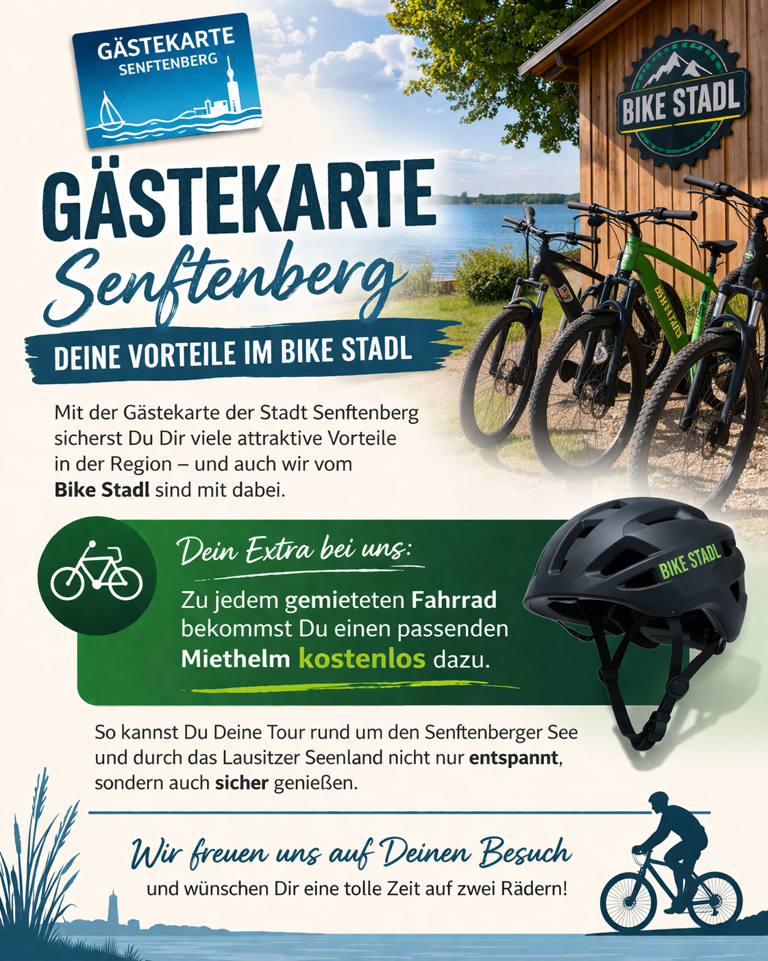 Mit der Gästekarte der Stadt Senftenberg sicherst Du Dir viele attraktive Vorteile in der Region – und auch wir vom Bike Stadl sind mit dabei.