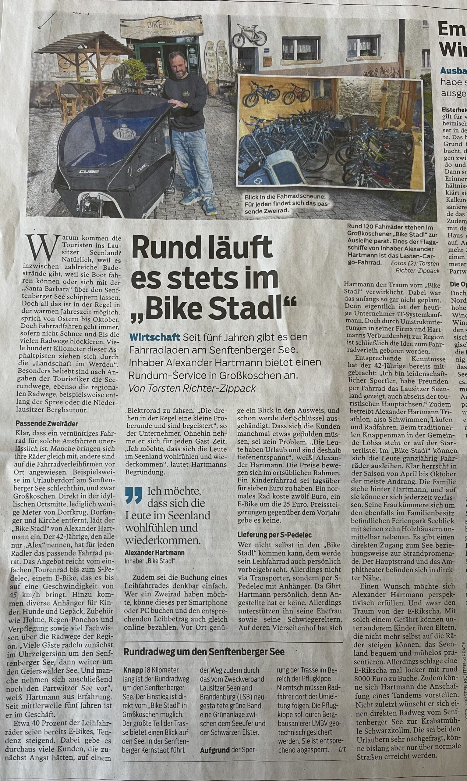 Ich freue mich wirklich sehr über den gelungenen Bericht in der Lausitzer Rundschau vom 08.04.2026 über unseren Bike Stadl hier in Großkoschen. Es macht mich stolz, unsere Entwicklung der letzten Jahre so schön zusammengefasst zu sehen.
